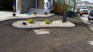 Final grade, standard sod, concrete curb edging, plants, rocks, mid-progress